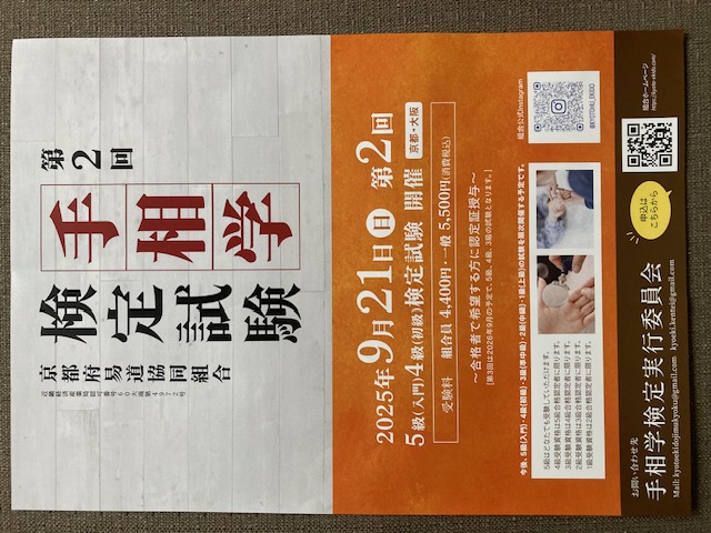四柱推命教室につづき、手相教室をアトリエにて始めます 本講座に先だって体験教室を開催しますので 興味のある方はぜひ参加してみてください 日時: 7月 3日 10時30分から12時 持ち物: 筆記用具 水分補給用の飲みもの 申し込み方法: 祥吉 メールアドレス showkichi355@gmail.com 電話 080-7848-6459 講師に京都府易道協同組合 副理事長 萃理(すいり)先生をお招きして はじめて手相占いを学んでみたい方を対象に講義していただきます その後、祥吉での本講座は秋ごろ(9月以降)を予定しています 9月には 第2回 手相学検定試験が開催されますので 勉強をつづけ検定試験にチャレンジすることも可能です くわしくは 京都府易道協同組合のHPをごらんください https://kyoto-ekido.com/